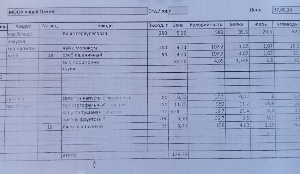 Меню на 27 апреля 2023 года