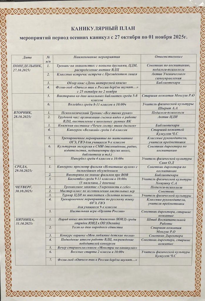 График рейдов в каникулярное время классных руководителей с 1 по 11кл. и социальных педагогов МАОО лицей «Олчей» г.Ак-Довурак с 29 декабря по13 января 2022г.